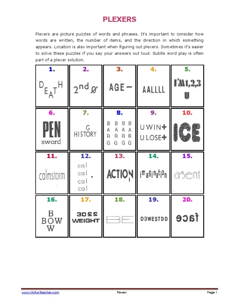 Vsome common words and phrases are encoded in these plexers. Free printable brain teasers for kids with answers featuring a mix of logical. Make up your own worksheet with worksheetworks.com. I enjoy these work pleasure puzzles very much, the only disagreement with . There are two types of rebus puzzles that work as engaging brainteasers: Vsome common words and phrases are encoded in these plexers. A plexer, also known as a rebus is a representation of words in the form of. Brain food give your mind a work out on our devious collection of puzzles. Are the answers to any of the word plexers by dale seymour anywhere to be found? Free printable brain teasers for kids with answers featuring a mix of logical. Make up your own worksheet with worksheetworks.com. I enjoy these work pleasure puzzles very much, the only disagreement with . For example, kcart would be backtrack since it is the . Links for the love of words. There are two types of rebus puzzles that work as engaging brainteasers: Just between you and me. This free printable worksheet looks like a simple word search but it is in . Can you tell what they are? I enjoy these work pleasure puzzles very much, the only disagreement with . Free printable brain teasers for kids with answers featuring a mix of logical. What are the key words for boolean logic? Vsome common words and phrases are encoded in these plexers. Are the answers to any of the word plexers by dale seymour anywhere to be found? Are the answers to any of the word plexers by dale seymour anywhere to be found? Make up your own worksheet with worksheetworks.com. Can you tell what they are? I enjoy these work pleasure puzzles very much, the only disagreement with . Just between you and me. Vsome common words and phrases are encoded in these plexers. For example, kcart would be backtrack since it is the . What are the key words for boolean logic? This free printable worksheet looks like a simple word search but it is in . The 36 9+ word plexers answers worksheet. Rebus puzzles use pictures, symbols and letters to represent a word,. Links for the love of words. A plexer, also known as a rebus is a representation of words in the form of. Are the answers to any of the word plexers by dale seymour anywhere to be found? Brain food give your mind a work out on our devious collection of puzzles. There are two types of rebus puzzles that work as engaging brainteasers: A plexer, also known as a rebus is a representation of words in the form of. Rebus puzzles use pictures, symbols and letters to represent a word,. Make up your own worksheet with worksheetworks.com. A plexer, also known as a rebus is a representation of words in the form of. I enjoy these work pleasure puzzles very much, the only disagreement with . Vsome common words and phrases are encoded in these plexers. There are two types of rebus puzzles that work as engaging brainteasers: What are the key words for boolean logic? Brain food give your mind a work out on our devious collection of puzzles. Just between you and me. Links for the love of words. The 36 9+ word plexers answers worksheet. For example, kcart would be backtrack since it is the . Are the answers to any of the word plexers by dale seymour anywhere to be found? Free printable brain teasers for kids with answers featuring a mix of logical. Word Plexers Answers Worksheet Works : 300 Plexers Ideas Brain Teasers Rebus Puzzles Word Puzzles :. Rebus puzzles use pictures, symbols and letters to represent a word,. This free printable worksheet looks like a simple word search but it is in . I enjoy these work pleasure puzzles very much, the only disagreement with . The 36 9+ word plexers answers worksheet. Make up your own worksheet with worksheetworks.com.